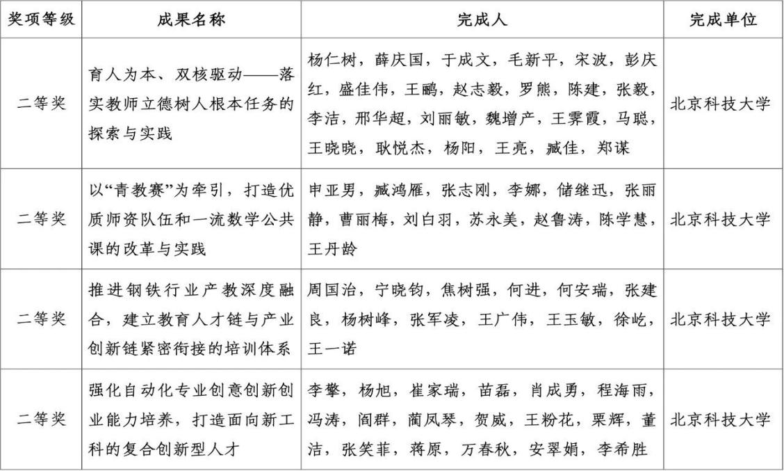 近日,教育部公布了《教育部关于批准2022年国家级教学成果奖获奖项目的决定》(教师〔2023〕4号)文件,我校主持的成果获高等教育(本科)国家级教学成果奖二等奖4项,获高等教育(研究生)国家级教学成果奖一等奖1项。其中,洗澡偷拍 与冶金与生态工程学院联合申报的以非学历教育为主要申报内容的《推进钢铁行业产教深度融合,建立教育人才链与产业创新链紧密衔接的培训体系》荣获高等教育(本科)国家级教学成果奖二等奖。该项目由学校冶金学科资深教授周国治院士牵头,洗澡偷拍 宁晓钧、何进(原书记)、张军凌、王玉敏、徐屹等同志共同参与完成。