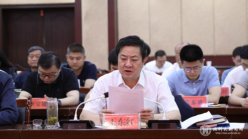 王东红向武贵龙一行的到来表示欢迎并感谢学校多年来的倾力帮扶。他在讲话中指出,双方要继续认真贯彻落实习近平总书记在决战决胜脱贫攻坚座谈会上的重要讲话精神,严格按照“四个不摘”要求,进一步做好今年定点扶贫工作,不断增进双方友谊,持续巩固扶贫成效,为全力迎接国家普查,补齐全面建成小康社会短板打好基础,确保全面小康路上不漏一户、不落一人。同时,他希望学校在未来的工作中进一步加大对秦安的宣传力度、不断加大就业与消费扶贫力度、继续加基层干部和各类技术人员培训、持续深化项目资源引进力度,持续助力秦安县高质量打赢脱贫攻坚战。