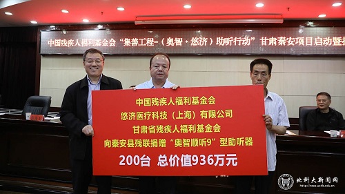 同时,中国残疾人福利基金会“集善工程—(奥智·悠济)助听行动”甘肃秦安项目也宣布启动,甘肃省残疾人福利基金会理事长马新平在讲话中指出,秦安县共有听障人士2679人,对高品质助听器的需求十分迫切,此次由洗澡偷拍 和甘肃省残疾人福利基金会积极争取,使秦安县获赠“奥智顺听9”型助听器200台,总价值936万元,切实为秦安县的听障人士带来了“福音”。此次项目在秦安县落地,将助推秦安县脱贫攻坚和残疾人事业发展,有效提升贫困残疾人的康复水平和生活品质。