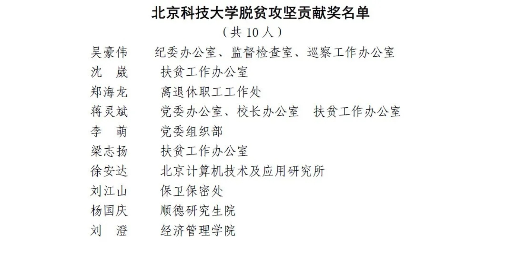 成绩的背后是一批又一批北科人的责任担当与辛勤付出,他们在脱贫攻坚的战场上留下了美丽的身影,在脱贫攻坚的历史上书写了壮美的篇章。